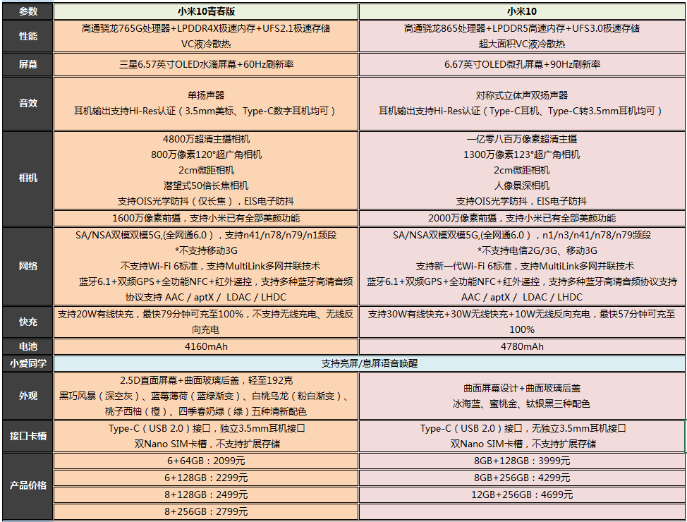 Xiaomi 10 青春版与Xiaomi 10的区别