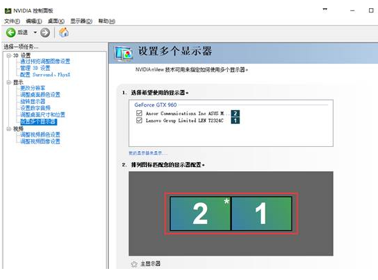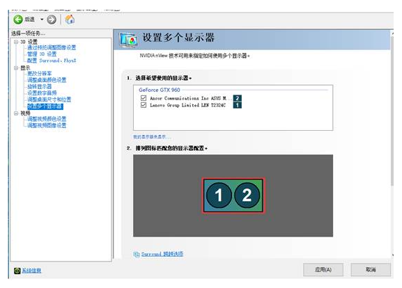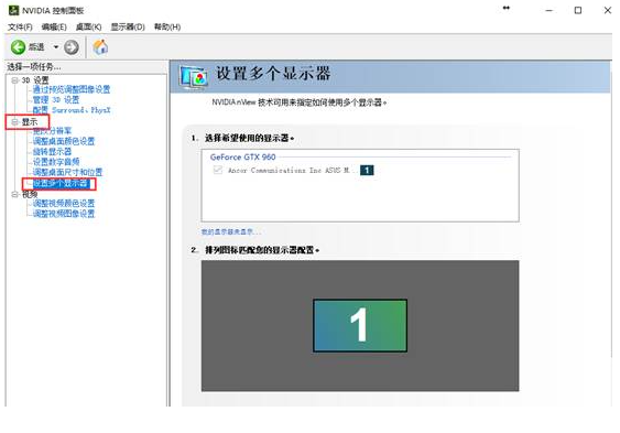 3. 单独NVIDIA显卡控制台打开后会有“显示”选项,点开可看到相关设置项,在“设置多个显示器”里可设置复制或扩展模式。(下图为仅连接一台显示器)